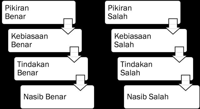 Secara sederhana dapat dikatakan bahwa nasib kita tergantung kepada apa yang ada dalam pikiran kita. Orang yang berpikiran positif atau benar maka akan menciptakan kebiasaan dan tindakan yang benar dan berujung pada nasib yang benar sedangkan sebaliknya orang yang selalu berpikiran negatif atau salah maka akan menciptakan kebiasaan dan tindakan yang salah dan berujung pada nasib yang salah.
