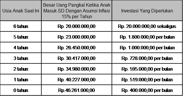Misalkan saat ini biaya masuk untuk uang pangkal SD di sekolah unggulan seharga 20 juta dengan kenaikan harga per tahun sebesar 15% maka sebagai orang tua anda dapat mempersiapkan dana pendidikan untuk anak dengan melakukan investasi secara rutin setiap bulannya dengan besaran sebagai berikut :